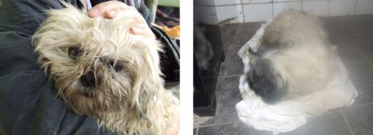 Szombaton két rossz állapotban lévő shit-zu szuka kutya került be a szekszárdi kutyamenhelyre. A két kutyát a város két különböző részén találták meg az önkénteseink. A kutyák szeme be van gyulladva, az állatorvos javasolta, hogy kozmetikussal vágassuk le a szőrt a szemük körül, hogy ne rosszabbodjon az állapot. Az egyébként kozmetikai gondozást igénylő kutyák szőre tele volt régi kibonthatatlan csomókkal. Az egyik kutyus teljesen vizesen, összefagyva került hozzánk. Ő egy fél napot töltött a menhelyen található egyetlen kályha mellett, hogy meg ne fázzon később.